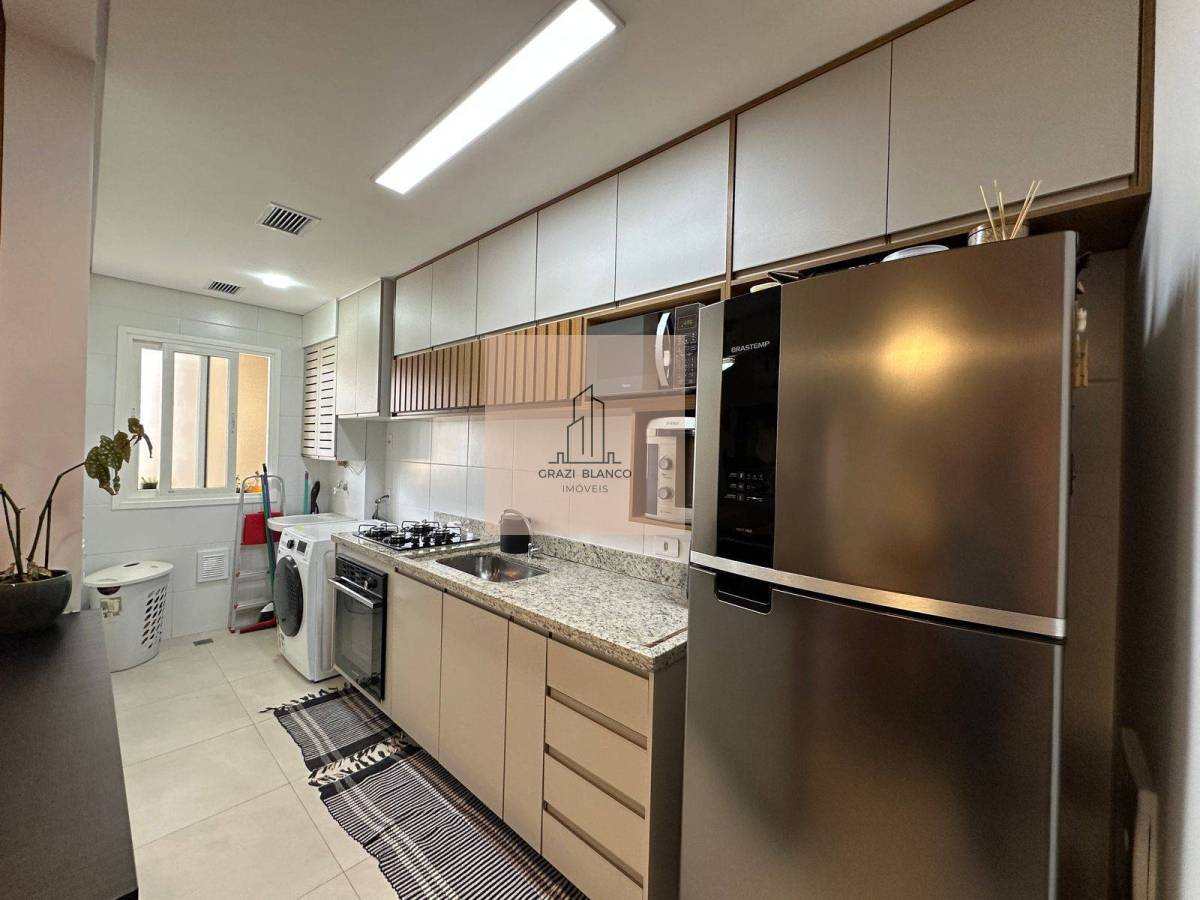 A cozinha com balcão americano em marcenaria fixa possui detalhes em ripado freijó, e seus novos eletrodomésticos como cooktop, forno embutido, depurador e filtro de água também ficará e o aquecedor a gás que abastece os 2 chuveiros dos banheiros.