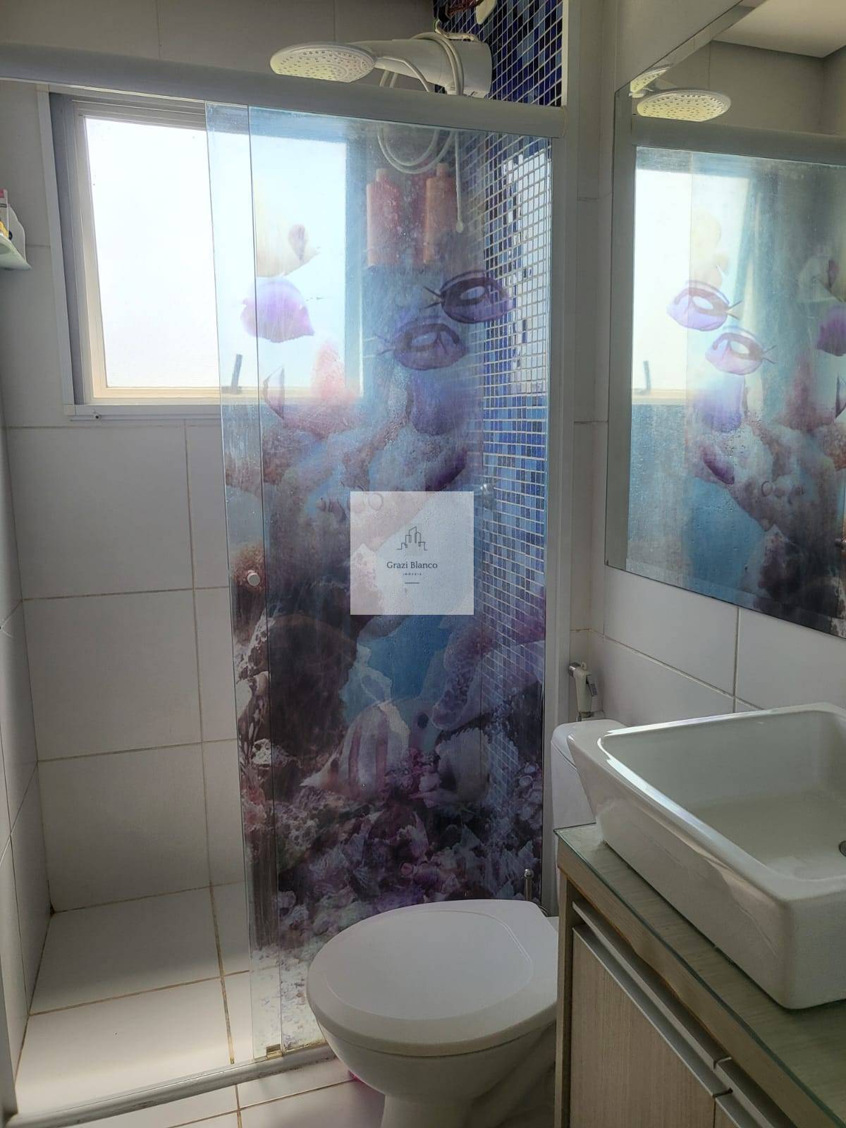 Banheiro social com Box, pastilhas e cabinete,
