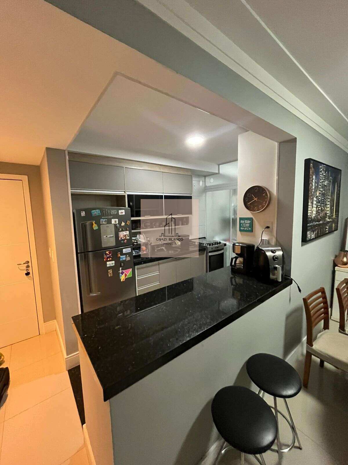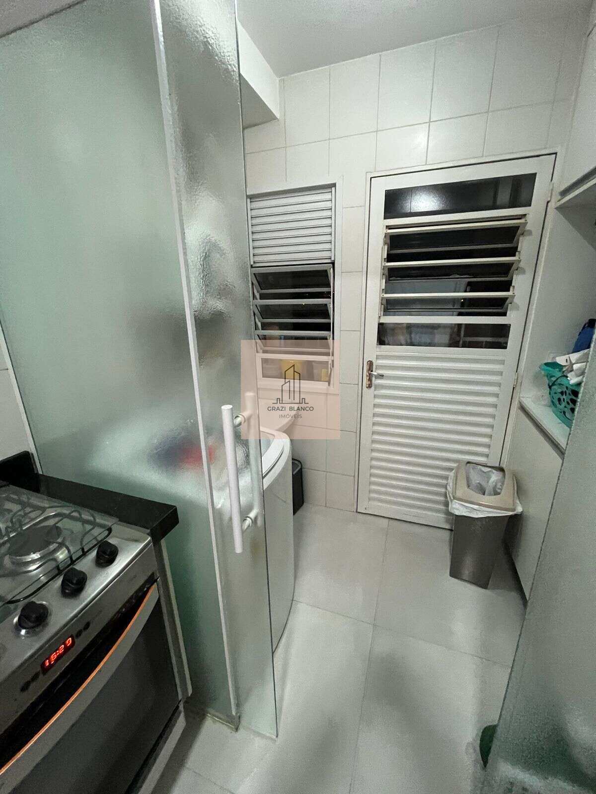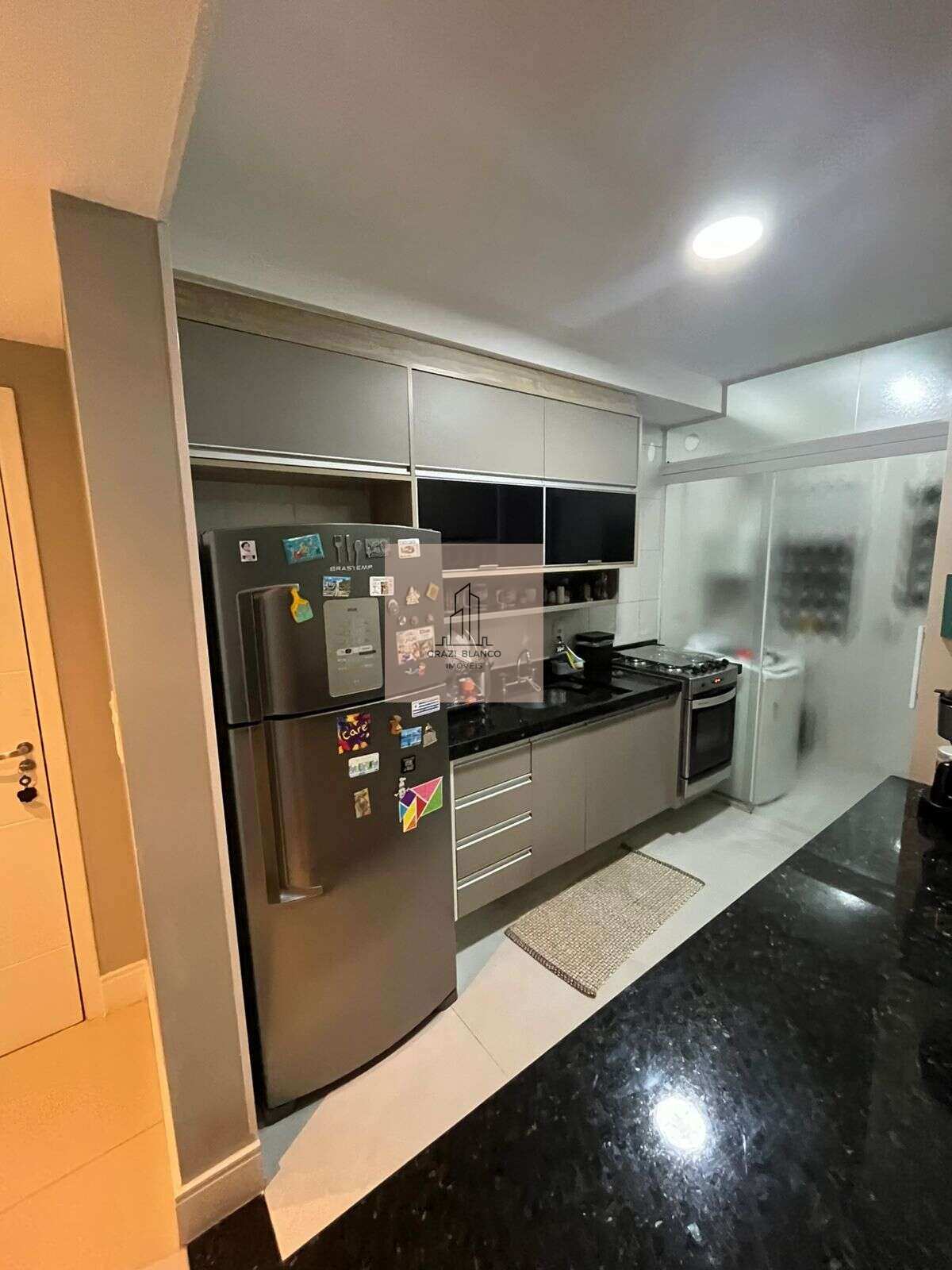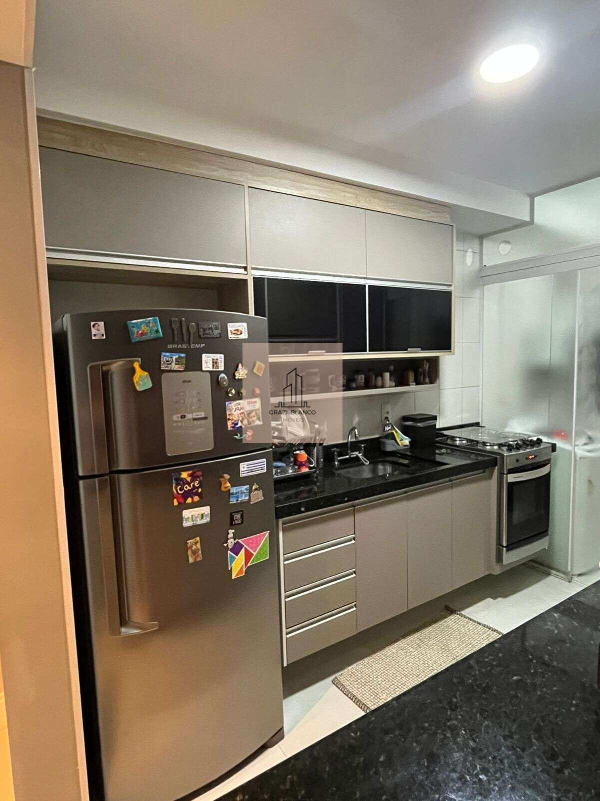Cozinha e Área de Serviço: Inclui balcão em granito preto, fogão embutir, metais Docol e aquecedor a gás.