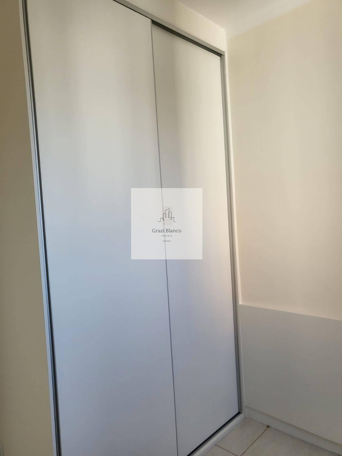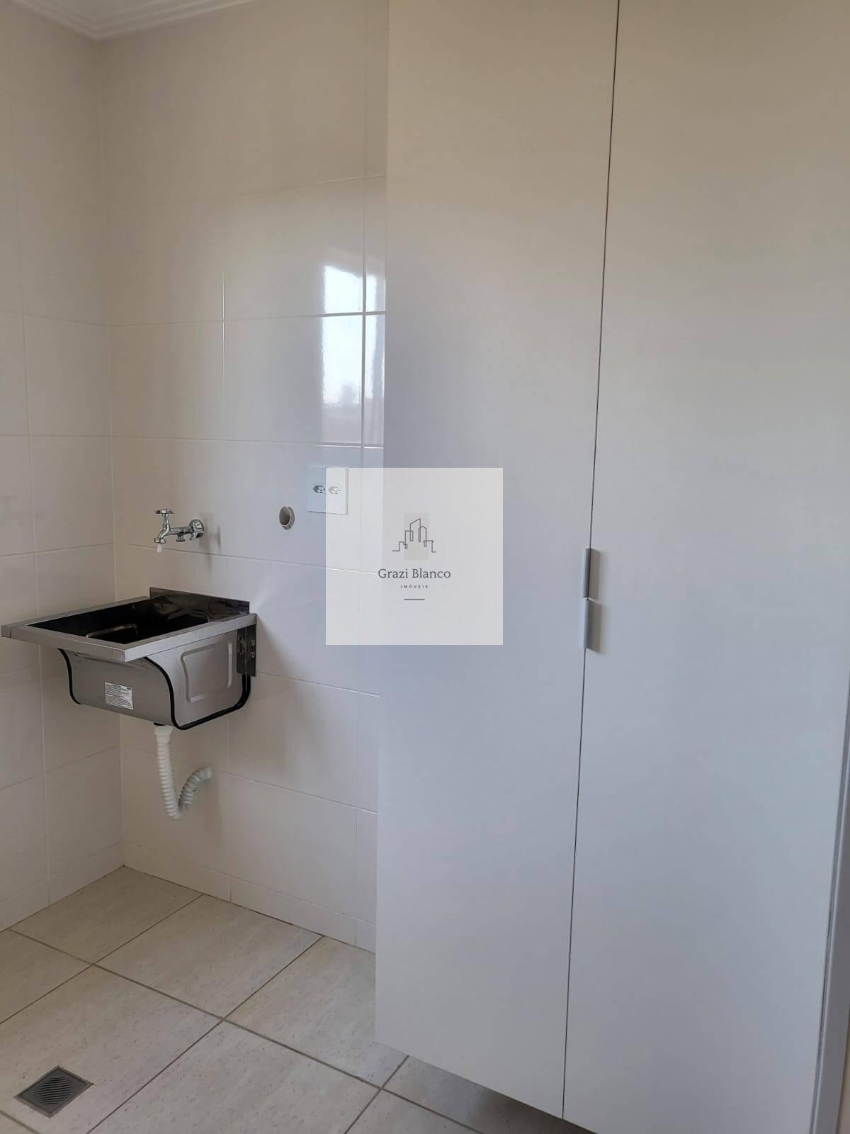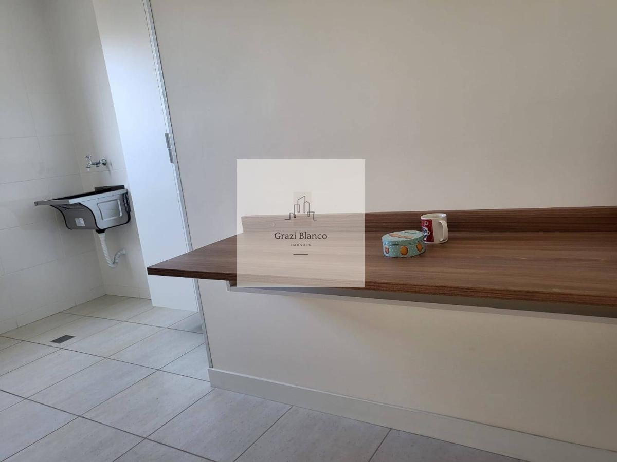 O apartamento tem armários na cozinha, lavanderia e dormitórios, painel de tv na sala e em um dormitório.