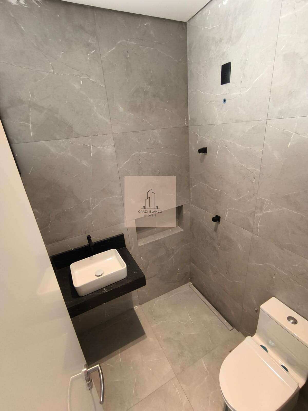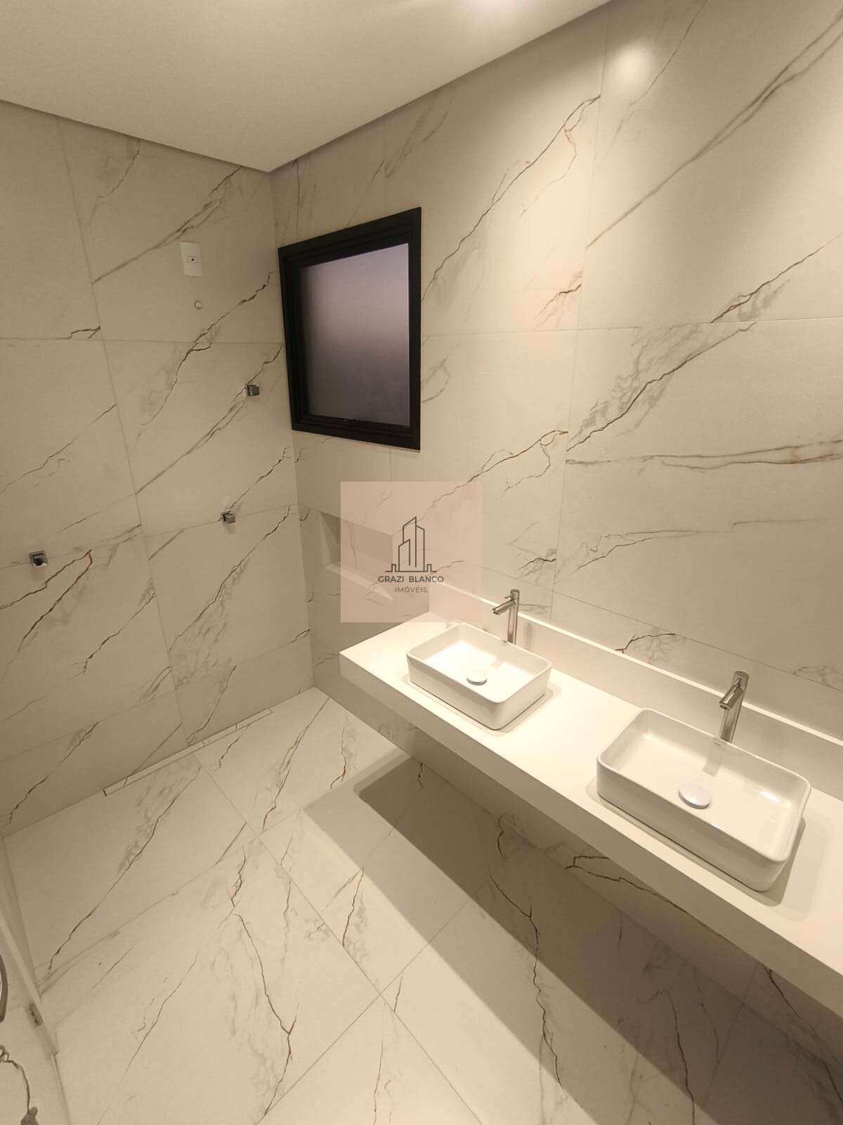 Na parte superior, a casa possui 4 suítes, sendo duas suítes master com closet, piso vinílico Injoy, banheiros modernos, todos revestidos em porcelanato, nichos com iluminação em LED, lavatório de bancada em preto Via Láctea e bacia sanitária monobloco.