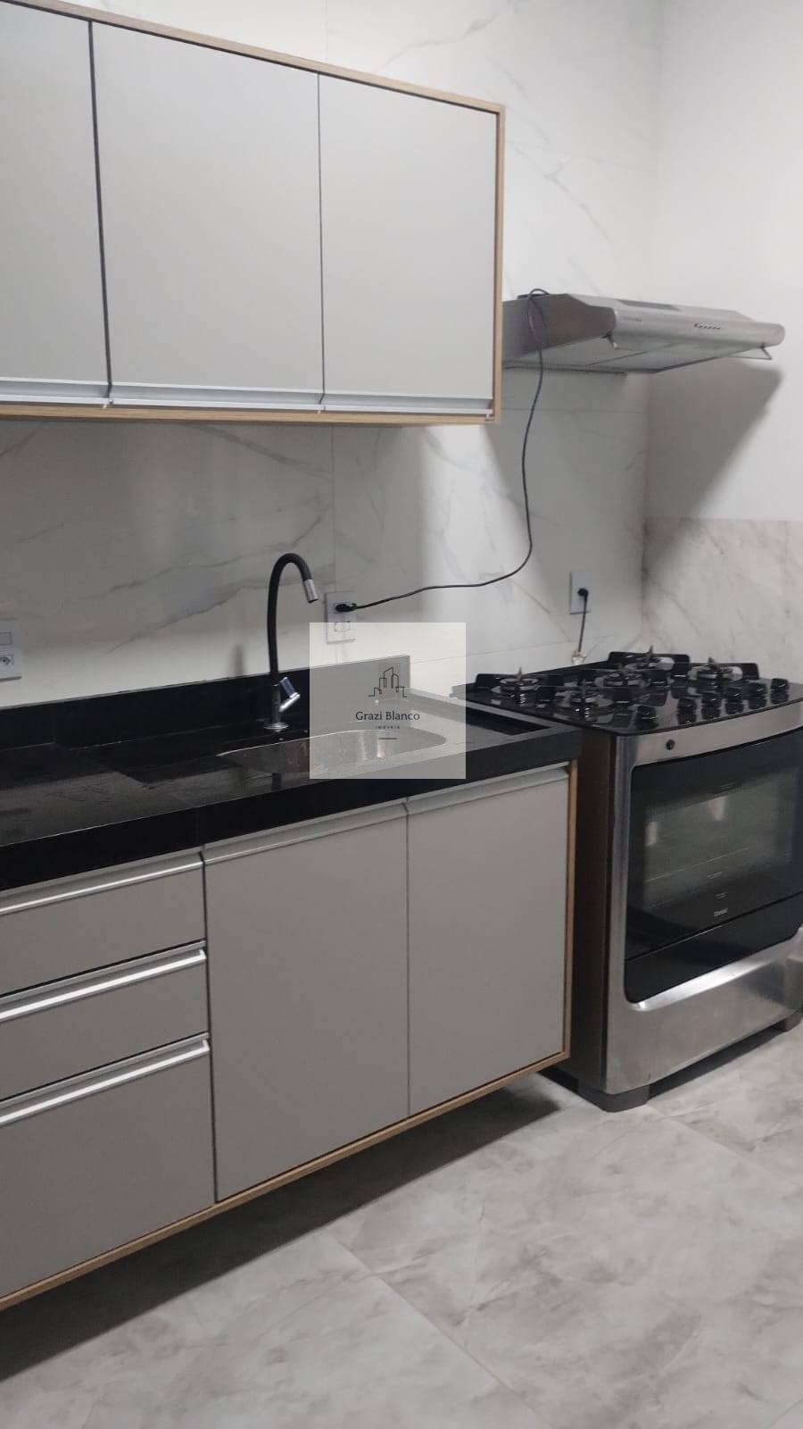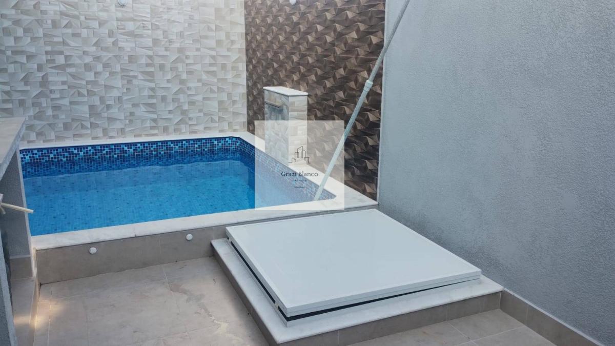 Sala dois ambientes, cozinha com armários modulados, banheiro social, piscina, quintal, lavanderia, duas vagas de garagem.