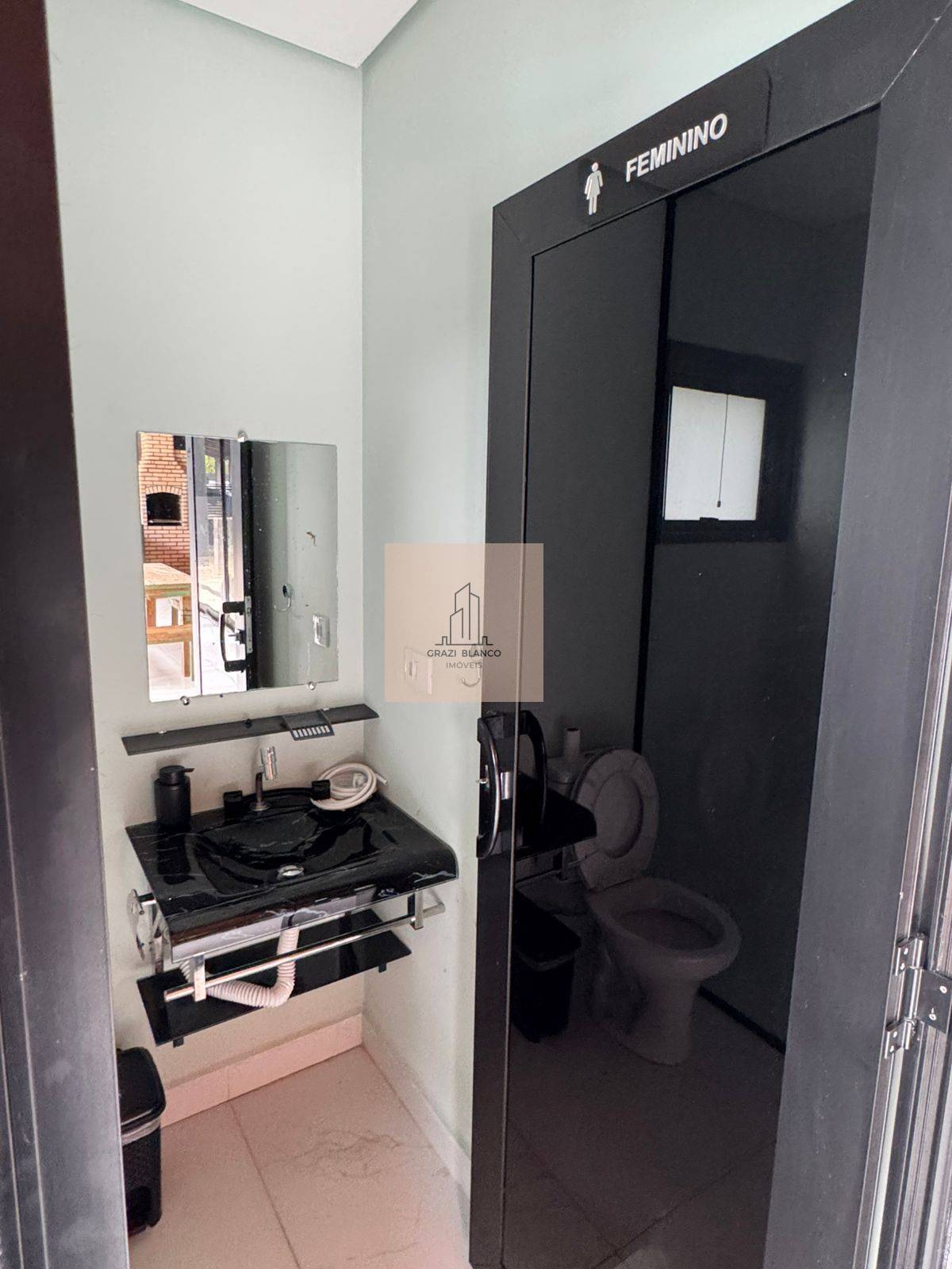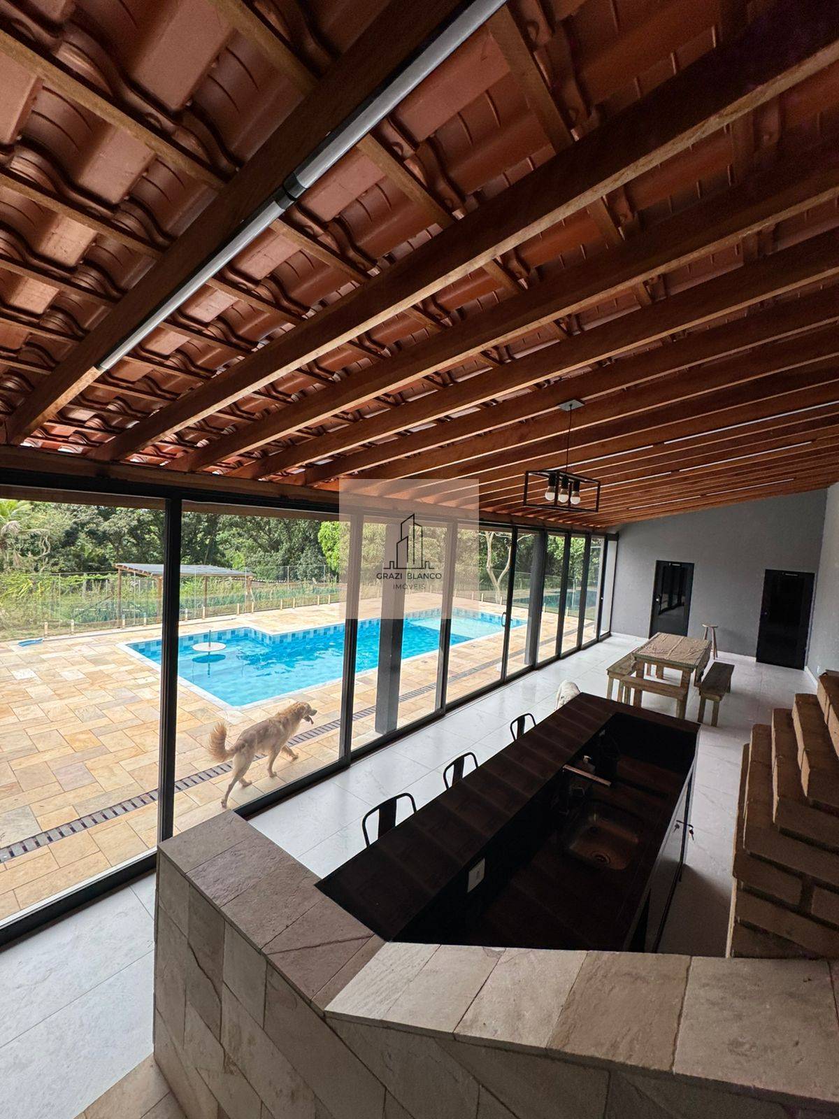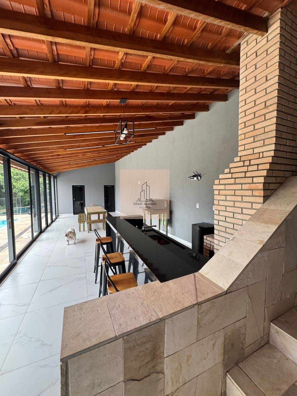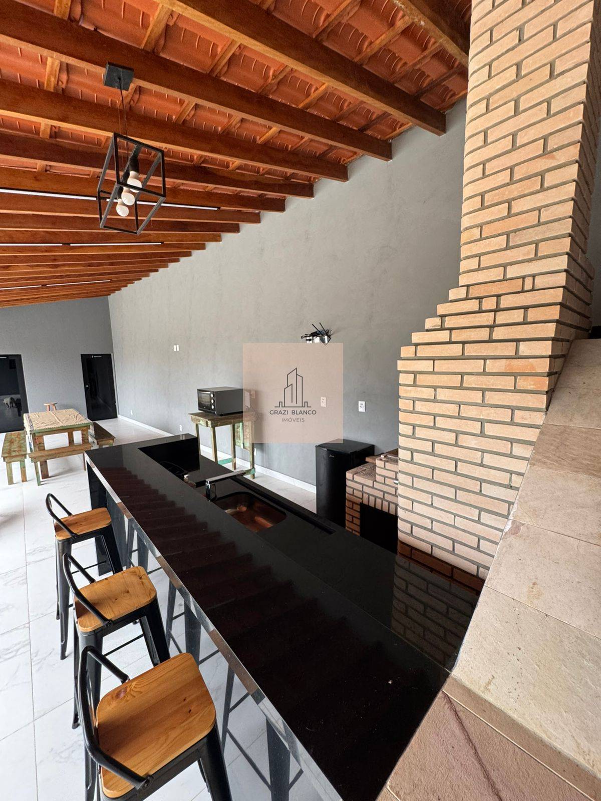 Área gourmet com 40 metros, incluindo churrasqueira e forno a lenha, além de banheiros masculino e feminino.