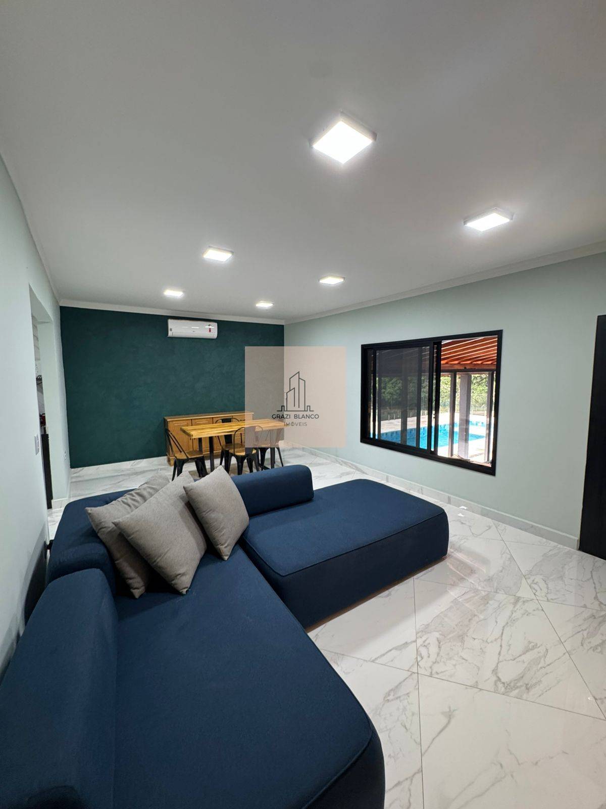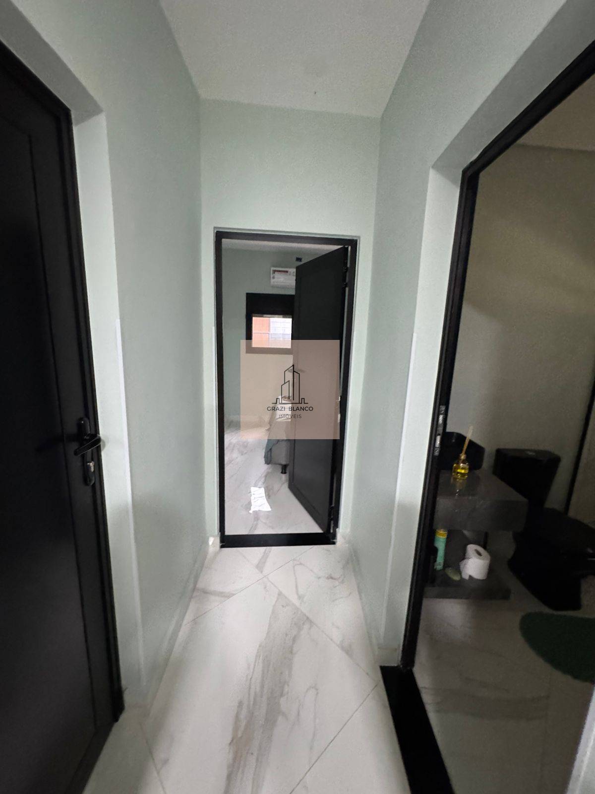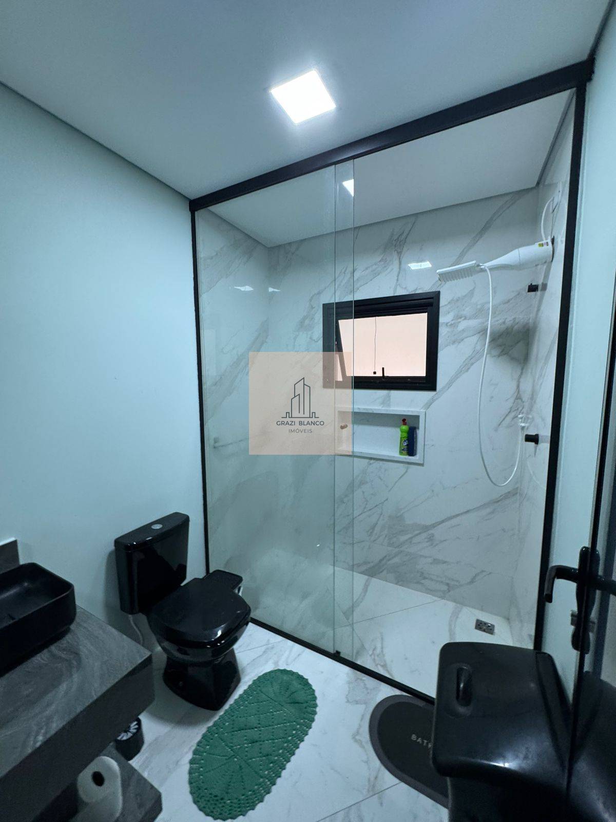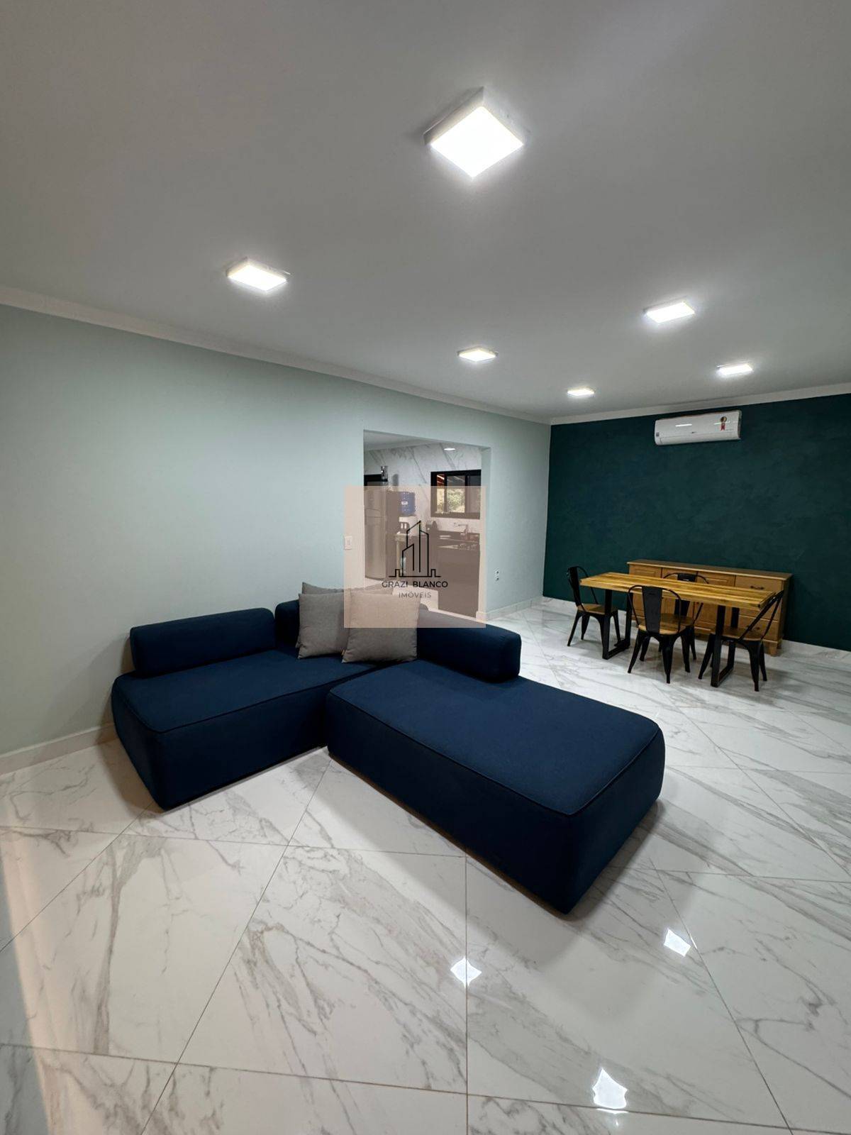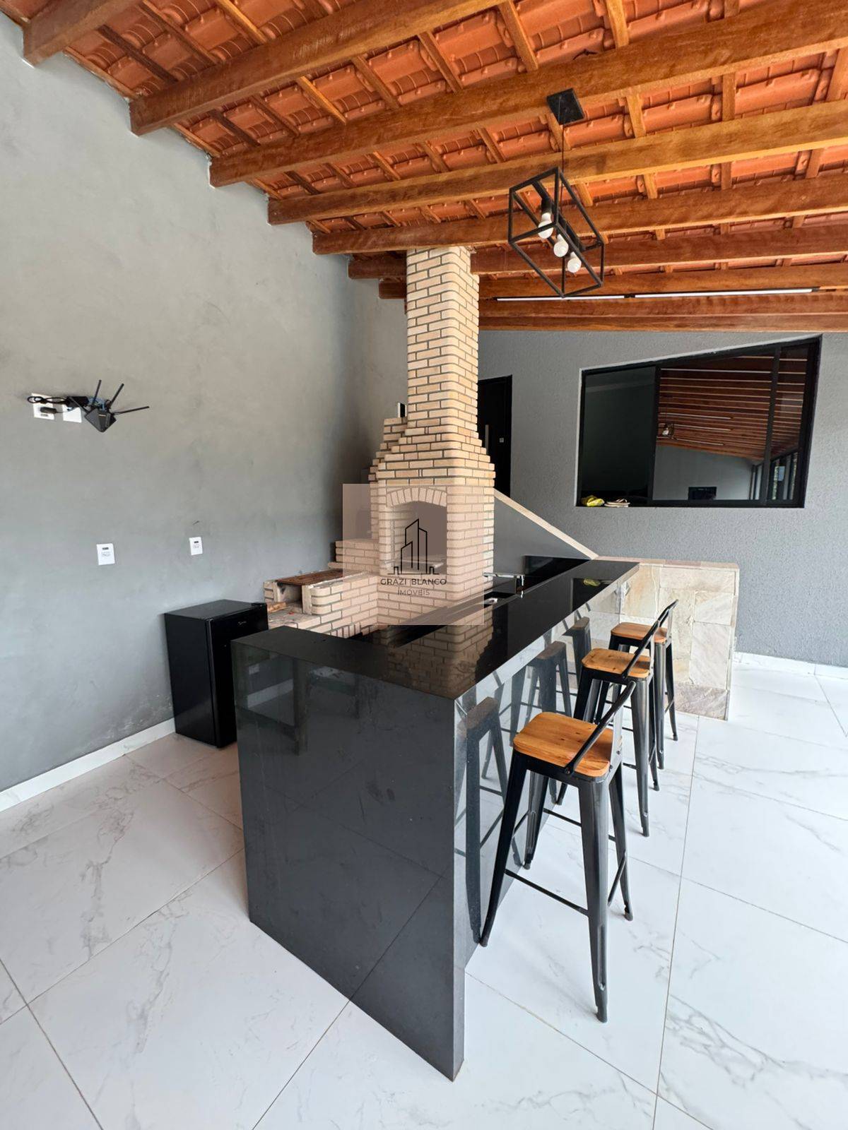 Casa com acabamentos em preto e cinza, incluindo ar condicionados em todos os cômodos.